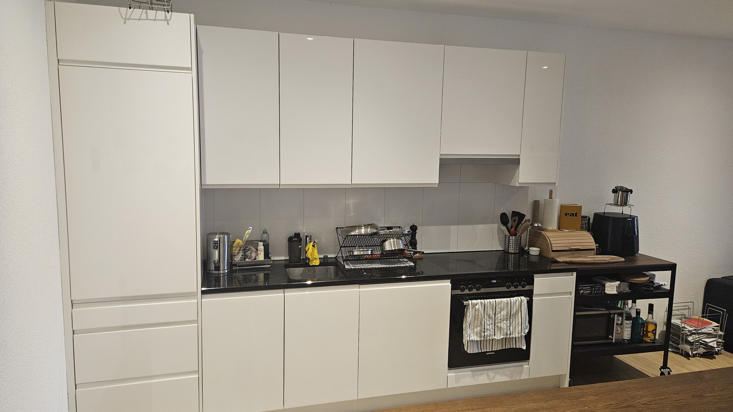 Die Küche ist mit einem modernen Kochfeld, einem Backofen sowie einer Abwaschmaschine ausgestattet und verfügt über ausreichend Stauraum.