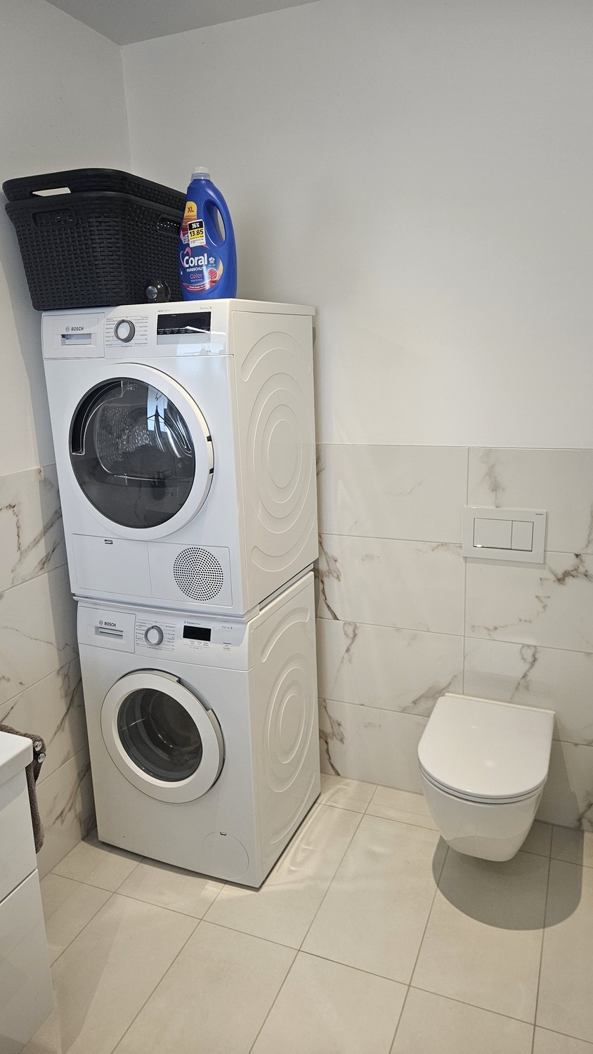 Die Wohnung verfügt über einen eigenen Waschturm (Waschmaschine und Trockner).