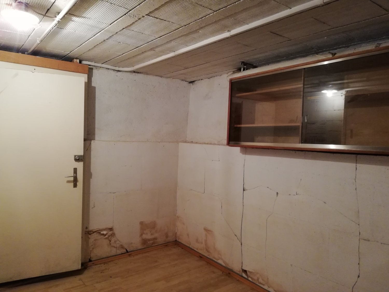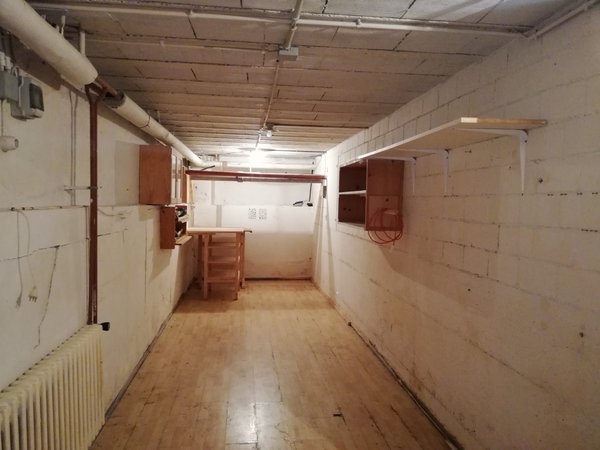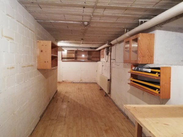 Kellerraum mit Holzdecke und Betonwänden, perfekt für Lagerung oder als Werkstatt