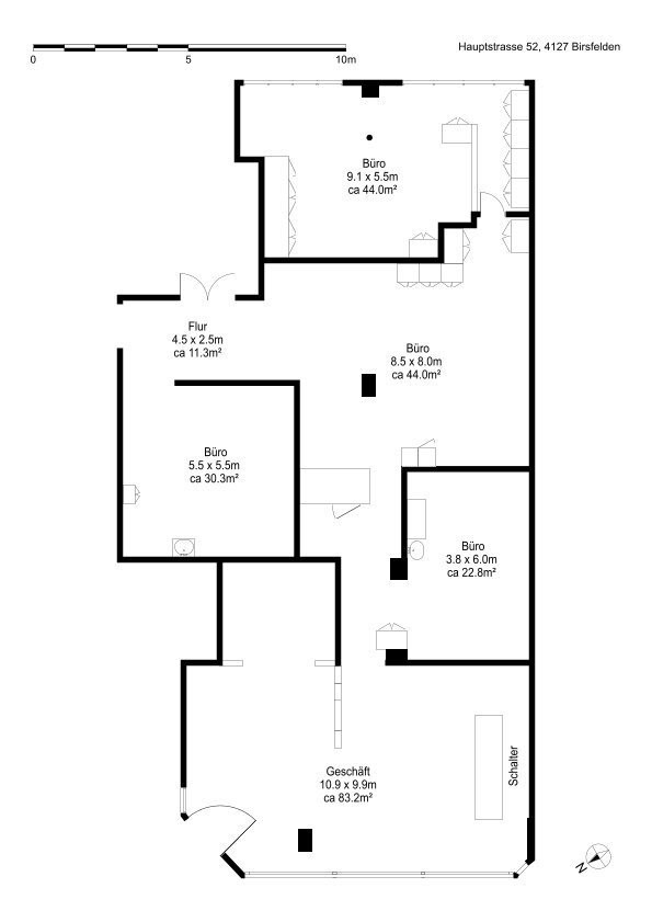 Im EG mit grossen Fenstern misst die Fläche ca. 272m2. Die Räumlichkeiten sind mit Bodenplatten ausgestattet. Der Wasseranschluss für allfällige Ausbauten ist vorhanden.