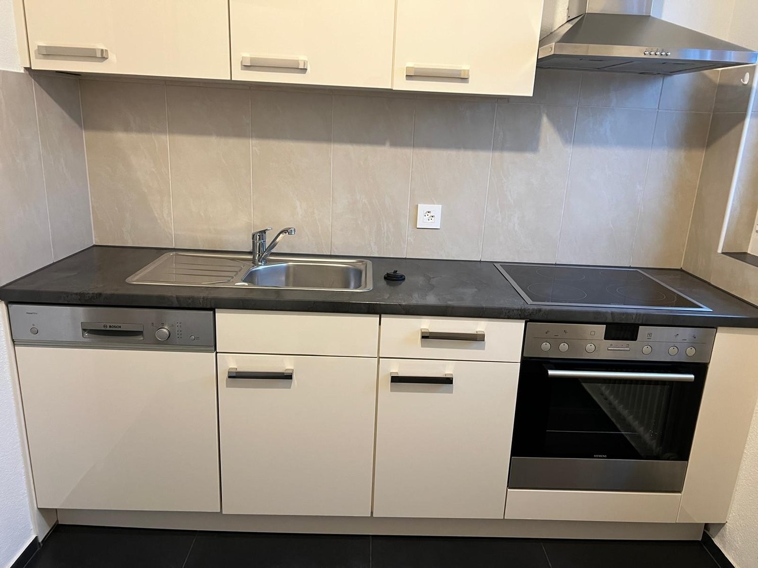 -moderne Küche mit Glaskeramik, Geschirrspüler, Dampfabzug, Kühlschrank