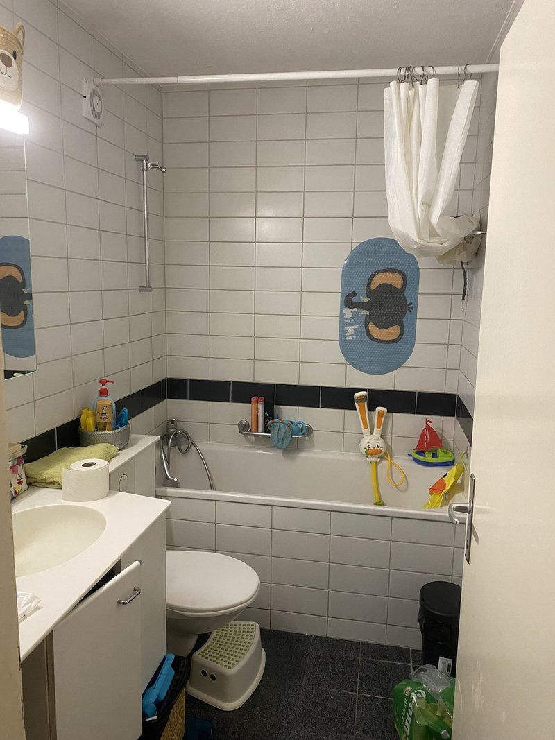Das Badezimmer ist gepflegt und verfügt über eine Badewanne. Zudem sorgen grosse Fenster in der ganzen Wohnung für eine freundliche und helle Atmosphäre.