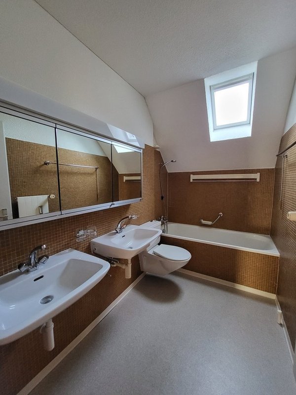- Nasszelle mit Badewanne, Doppellavabo und Fenster