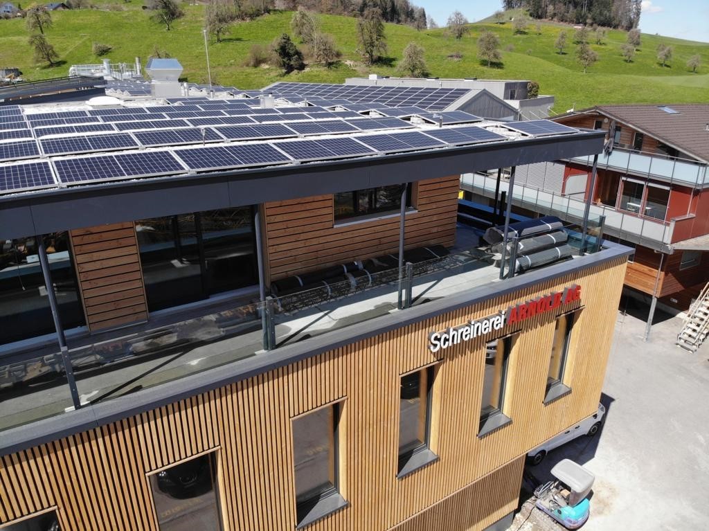 Das Gewerbehaus der Schreinerei ARNOLD AG wurde in einem sehr nachhaltigen Standard gebaut. Raumhohe 3-fach verglaste Fensterflächen sowie elektrischen, modernen Sichtstoren. Das ganze Gewerbehaus wird durch Solareigenen Strom betrieben. Der energie-effiziente Standard des Gebäudes entlastet zudem die Nebenkosten.