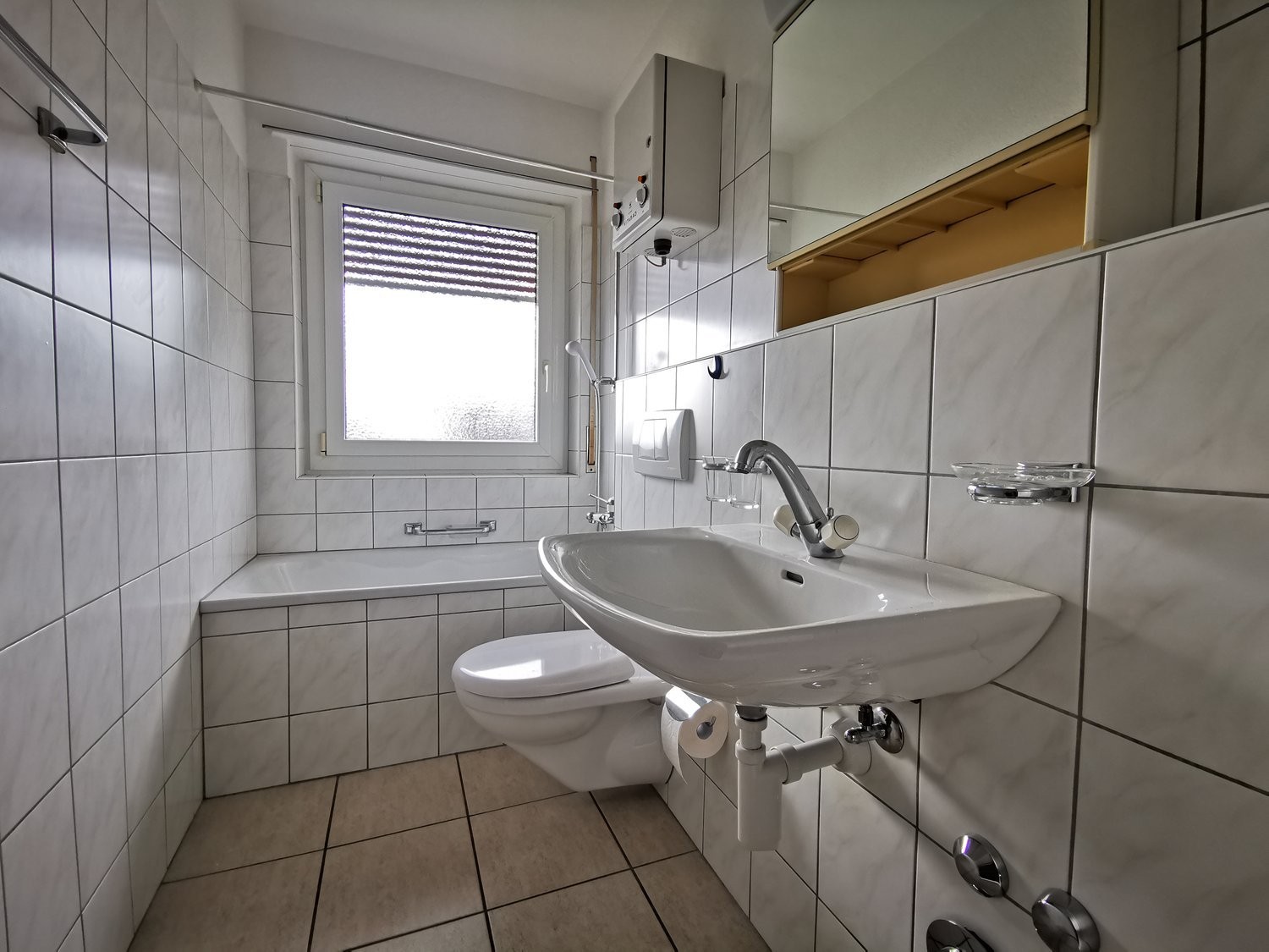 Kleines Badezimmer mit Badewanne und Fenster