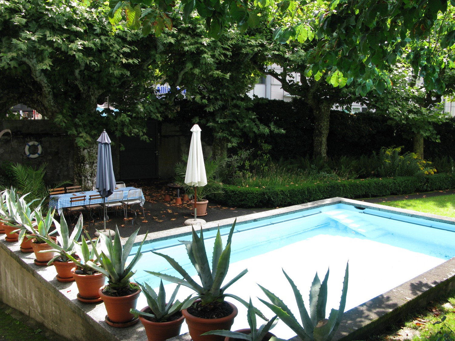 Die unter Denkmalschutz stehende Gartenanlage mit eigenem Pool kann mitbenutzt werden.