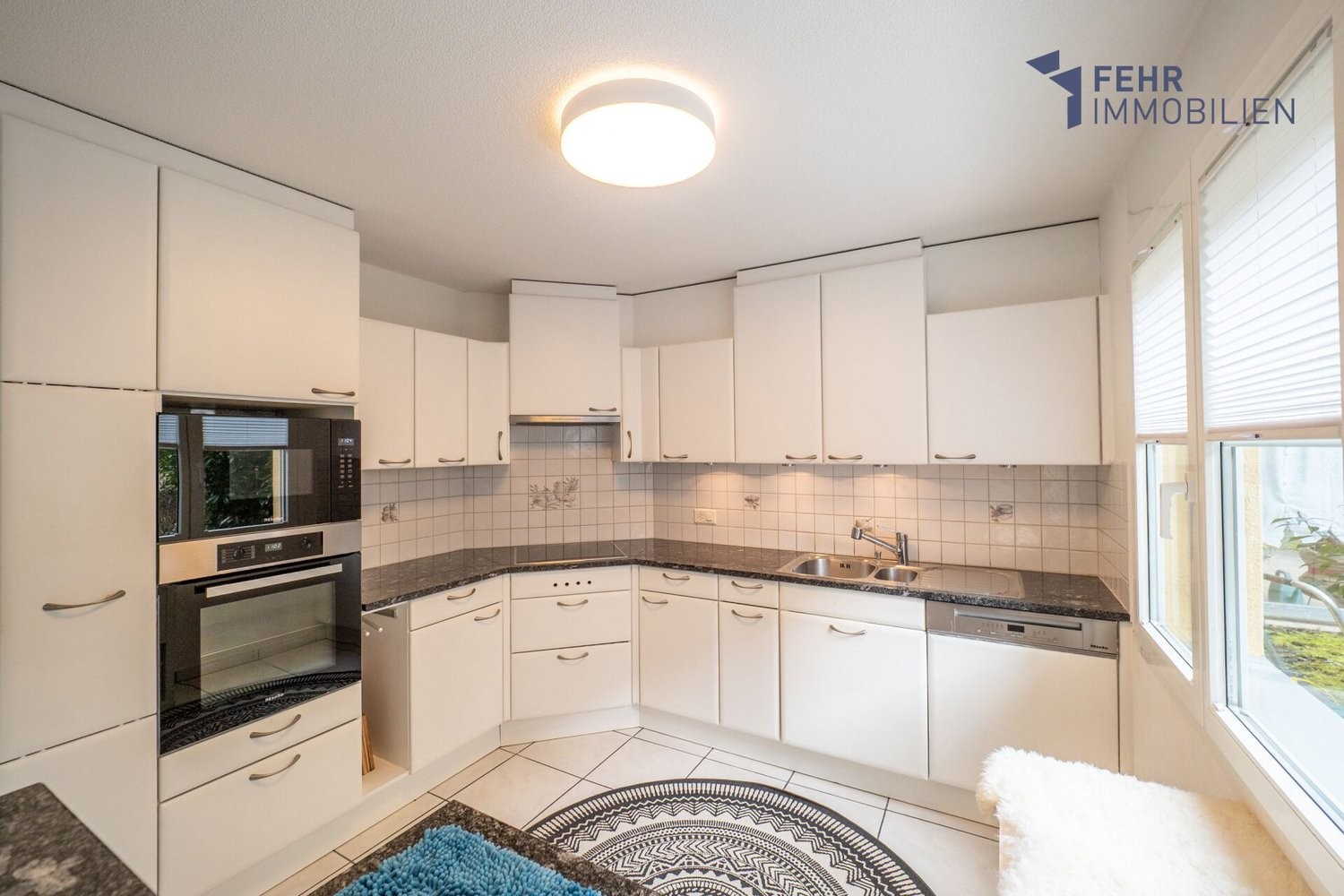 Die offene Küche ist mit neuwertigen Miele-Geräten ausgestattet, darunter ein Glaskeramikherd, ein Geschirrspüler sowie ein Backofen und eine Mikrowelle in ergonomischer Höhe. Zahlreiche Schränke bieten grosszügigen Stauraum und praktische Ablageflächen. Ein Frühstückskaffee an der Küchentheke lässt den Tag entspannt beginnen.