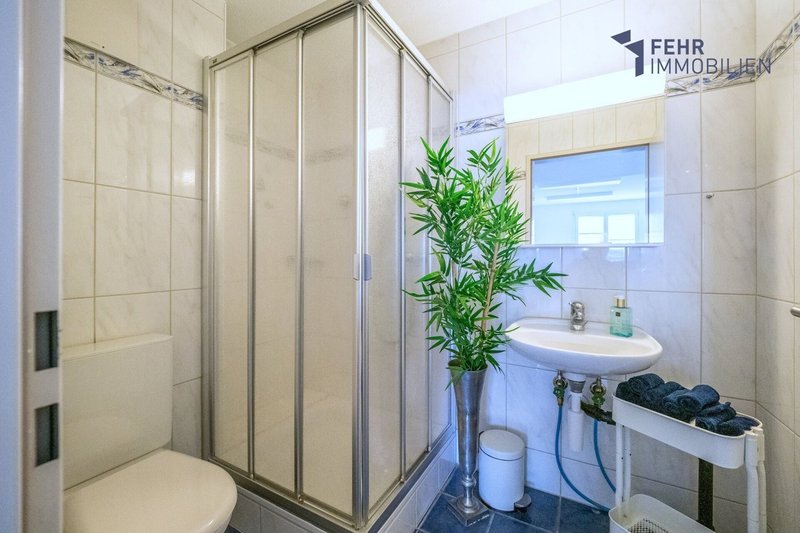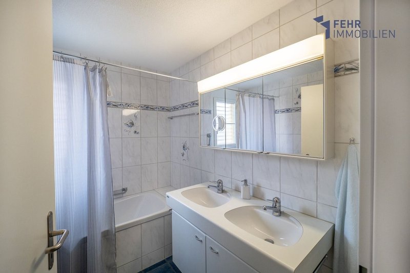 Gegenüber befindet sich ein Bad mit Dusche, WC und Lavabo. Am Ende des Flurs, direkt gegenüber dem Elternschlafzimmer, befindet sich ein Tageslichtbad mit Badewanne, Doppellavabo mit Unterschrank, WC sowie Waschturm (WM/TU). Praktische Einbauschränke im Flur bieten zusätzlichen Stauraum. Die gesamte Wohnung ist mit pflegeleichten, weissen Keramikfliesen ausgestattet.
