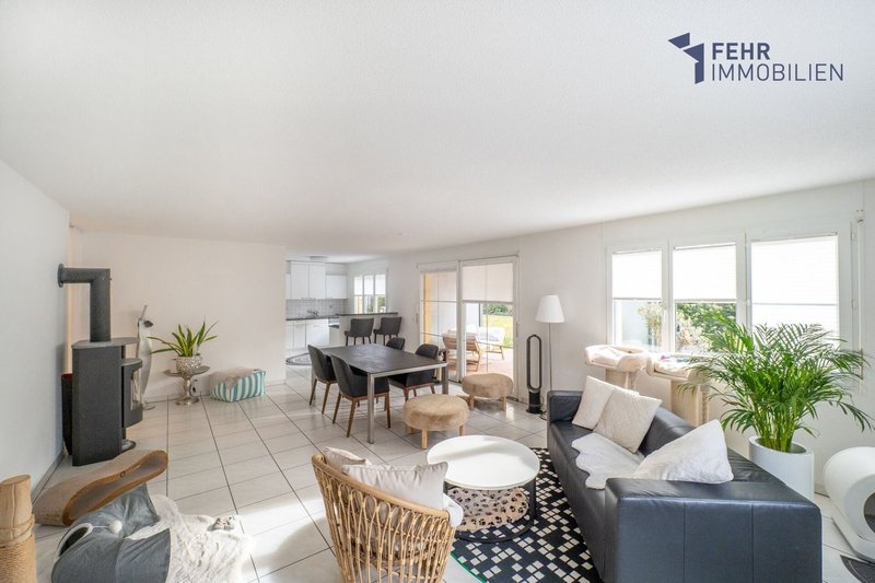 Vom Wohnungseingang gelangen Sie in den lichtdurchfluteten Wohn-/Essbereich mit grosszügigen Fensterfronten und offener, geräumiger Küche.