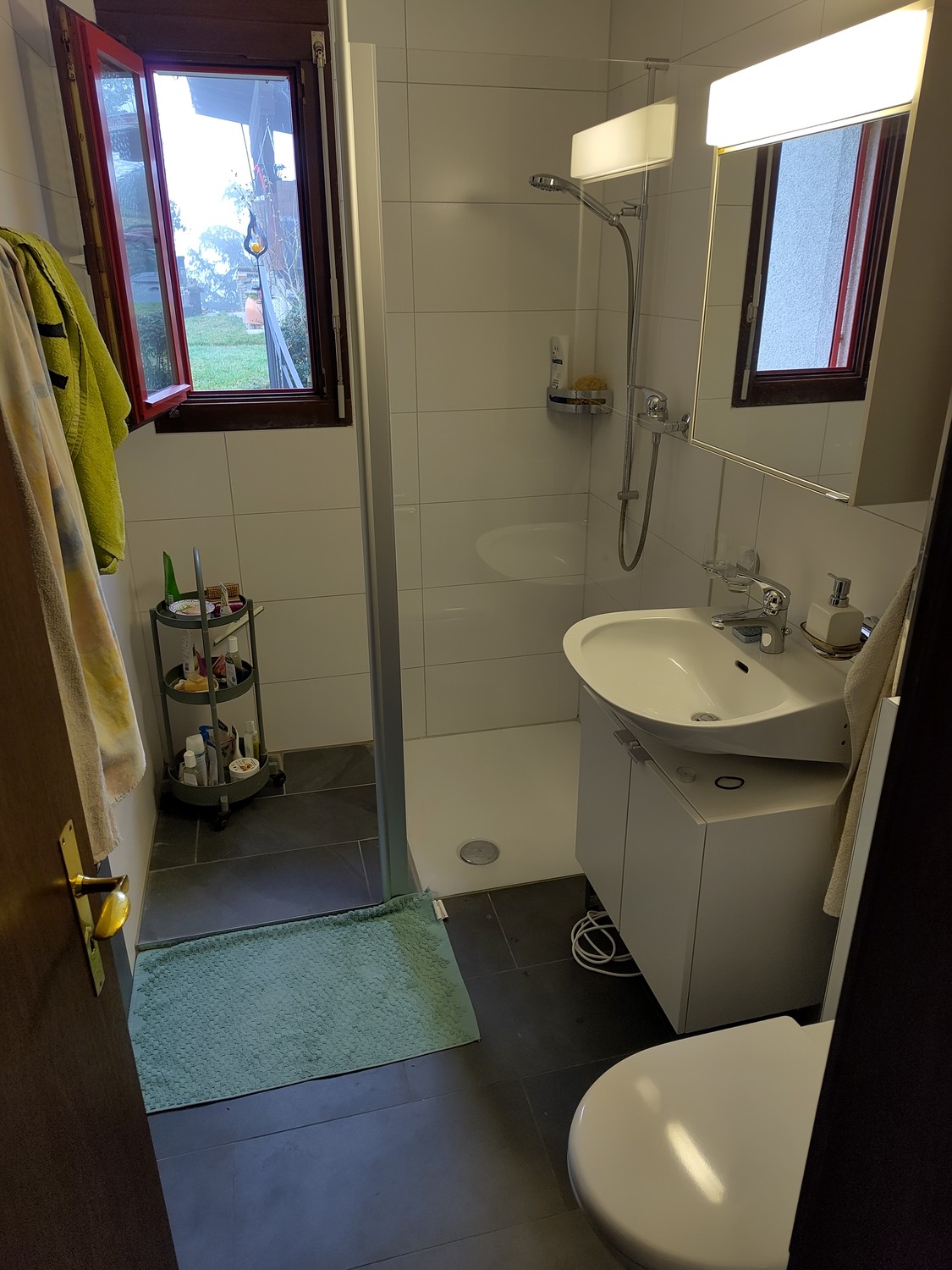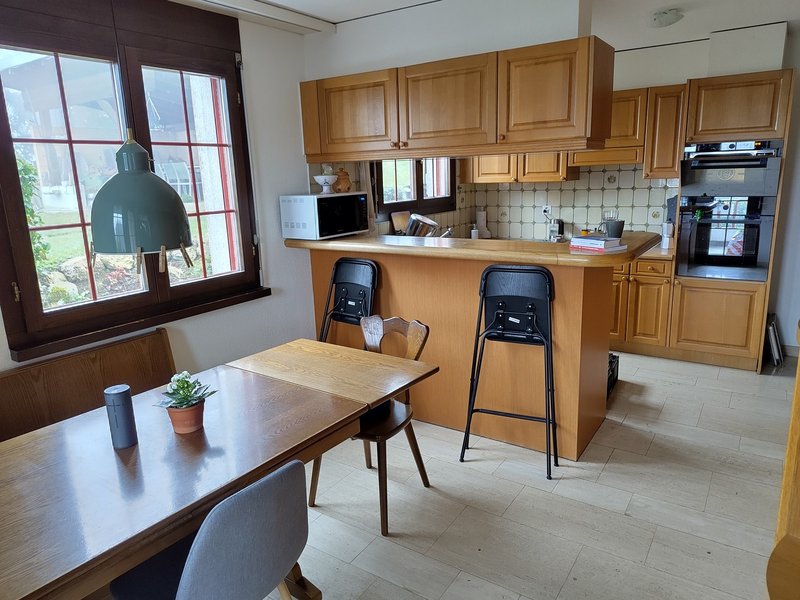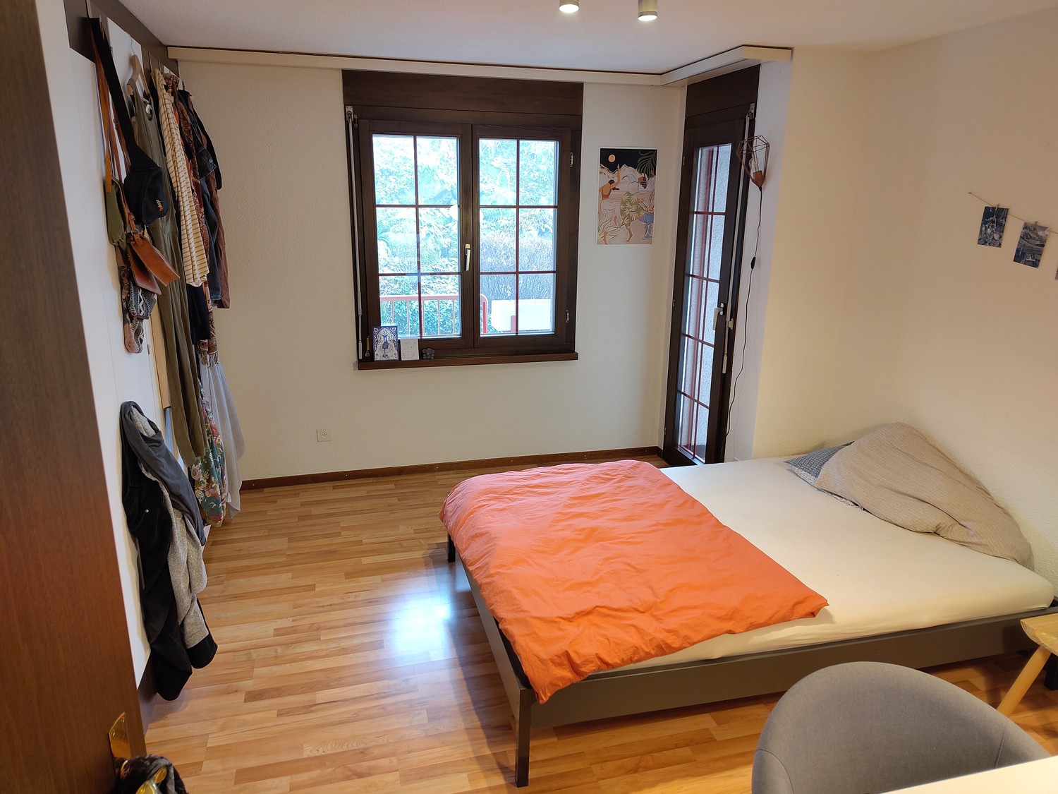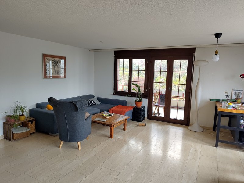 Die ruhig gelegene Wohnung am Waldrand hat drei Schlafzimmer, zwei Badzimmer, eine gut eingerichtete Küche, ein grosses Wohnzimmer und eine grosse Terrasse. Den Gartensitzplatz mit Pool und superschöner Aussicht dürfen wir mitbenutzen. Dein Schlafzimmer hat einen Einbauschrank integriert und direkten Zugang zur Terrasse. Bei Bedarf kann das Bett übernommen werden.