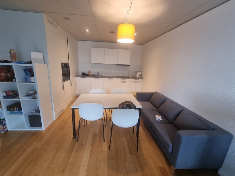 Living: Bright living/dining area with access to the balcony. Kitchen: Induction hob, oven, dishwasher, fridge/freezer. Bathroom: Large, level-access walk-in shower. Comfort: Floor heating; shared laundry on the same floor. Outdoor: Balcony for fresh air and light. Storage/Parking: No separate cellar/attic; parking by arrangement with the landlord (Studentlodge). Pets: Not allowed. Rent: CHF 1,690 net + CHF 190 utilities = CHF 1,880/month. Deposit: CHF 1,500.Furniture: The apartment is furnished, apart from the 2 Kallax and Optional takeover of the work desks and the black sofa (details upon request).Lease takeover: Seeking a solvent new tenant under the same conditions as the current contract. Contract is handled by the landlord (Studentlodge).