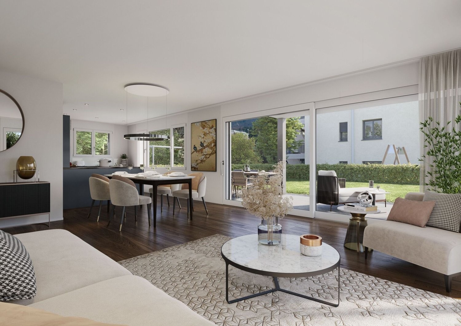 Ideal für Familien und Paare: Das rund 1427 m² grosse Grundstück liegt an zentraler Lage an der Hindelbankstrasse. Die beiden Häuser sind zurückversetzt und machen so nicht nur Platz für zwei Besucherparkplätze, sondern auch für einen attraktiven Aussenraum. Am nördlichen Ende der Parzelle entsteht gut geschützt und umgeben von Hecken ein Kinderspielplatz.