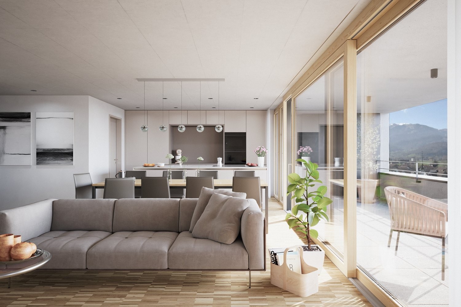 Offener Koch-, Wohn und Essbereich mit Zugang zum Reduit