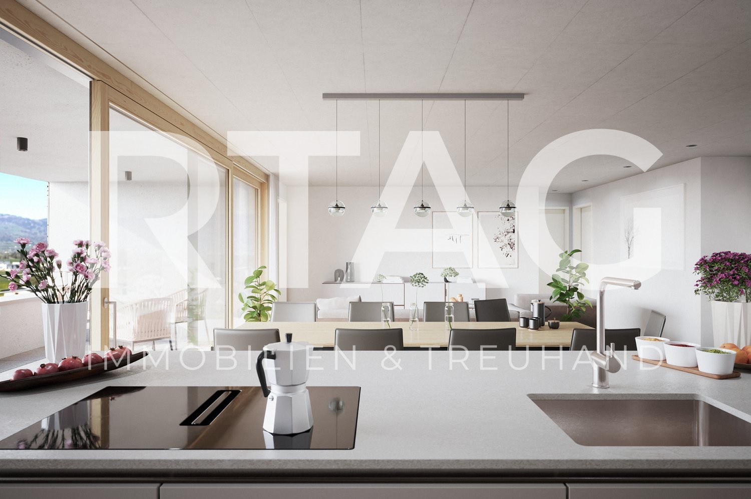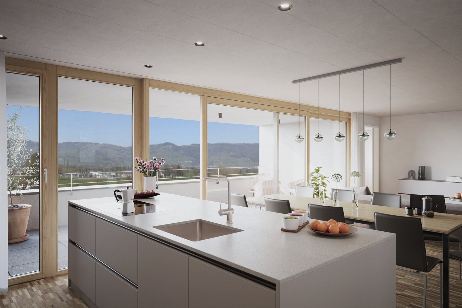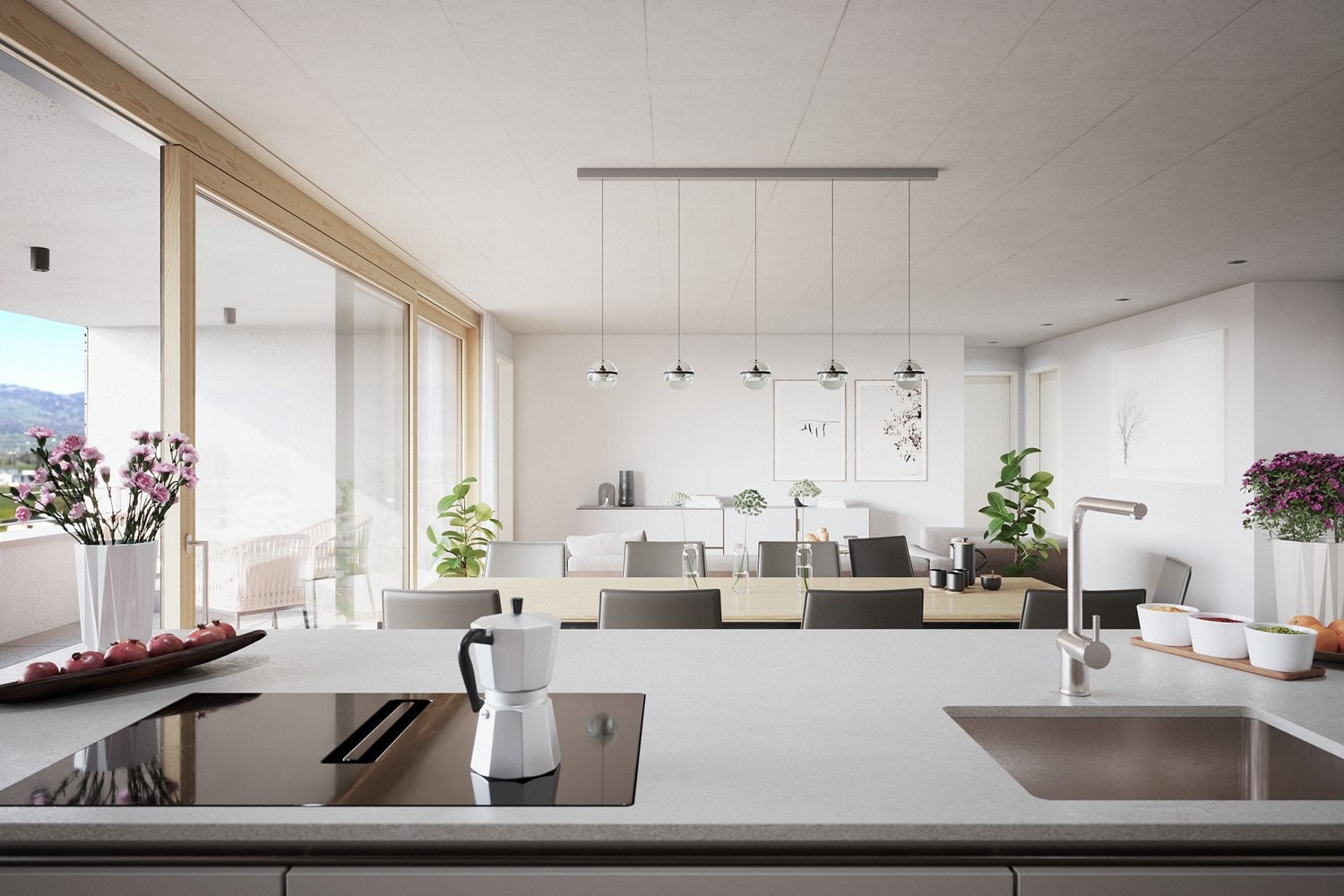 Offener Koch-, Wohn und Essbereich mit Zugang zum Reduit