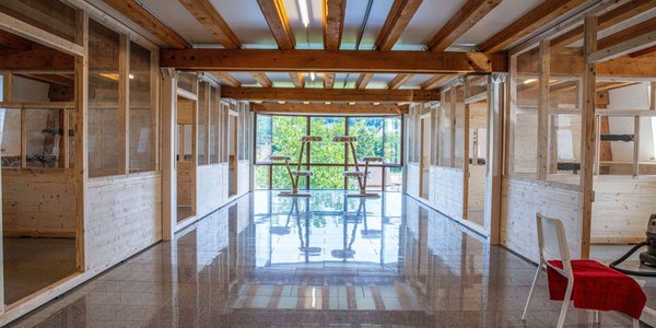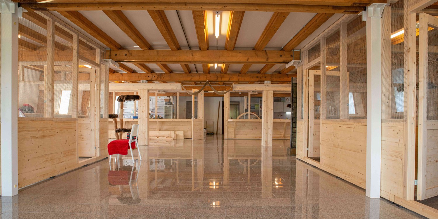 Der Innenausbau wurde für eine Katzenpension gebaut, und wurde vom kant. Veterinäramt im 2019 bereits einmal bewilligt. Die Aufteilung ist wie folgt: 1 Gruppenhaltung à 125m2, 6 Einzelzimmer à 13m2 und 1 Empfangsbereich à 97m2.