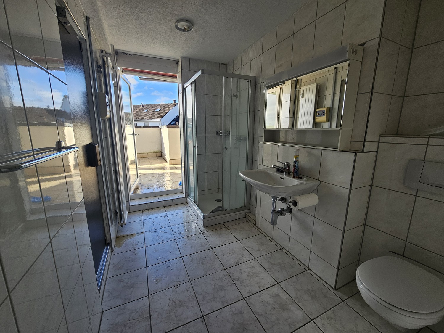 Ein großzügiges Badezimmer mit Dusche und direktem Zugang zur Terrasse