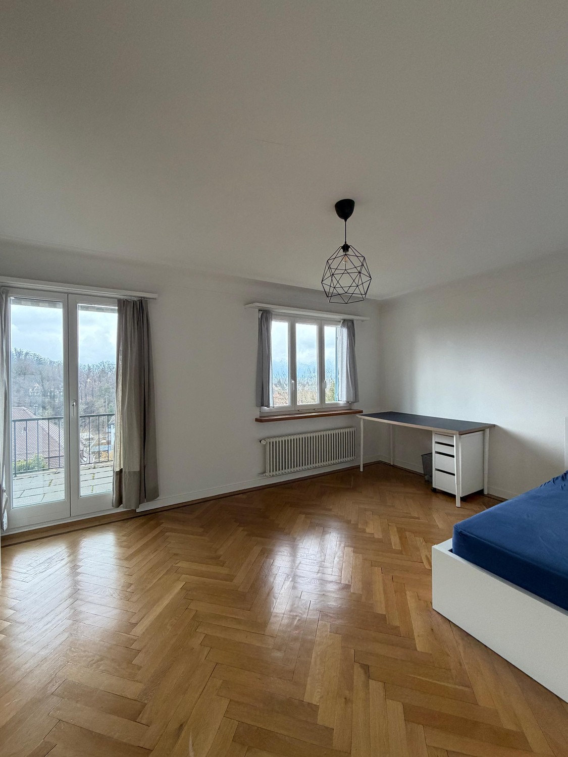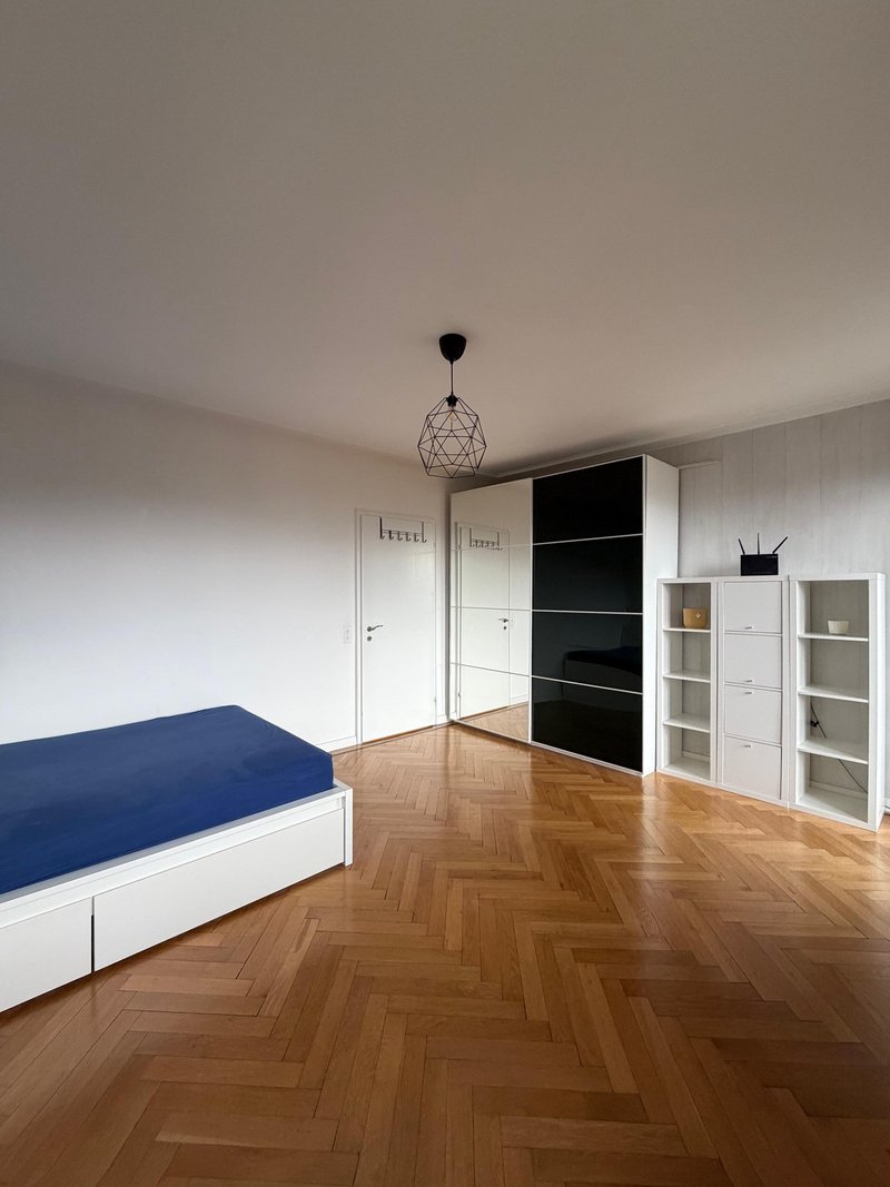 Du bekommst ein 19 m² grosses Zimmer im ersten Stock der Wohnung mit direktem Zugang zu einem der Balkone.