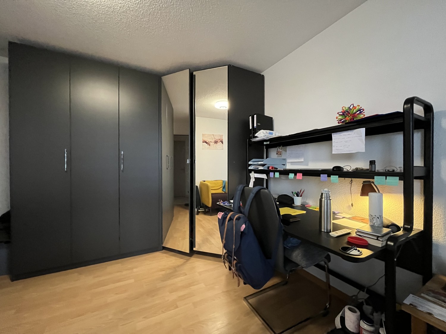 Das Zimmer ist ca. 16 m² gross, hat Parkettboden und einen grossen Kleiderschrank.
