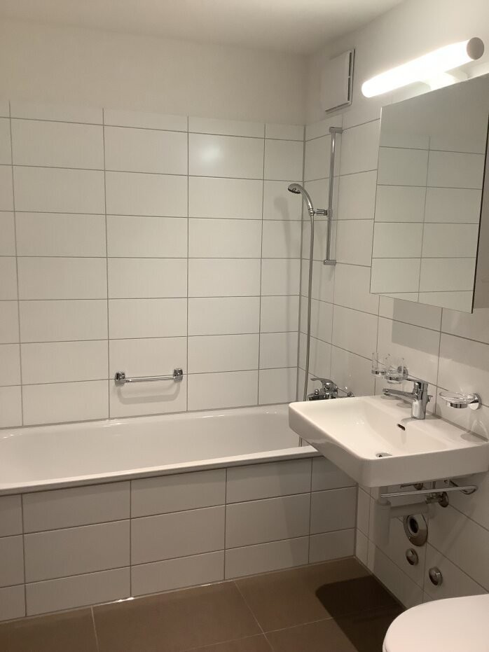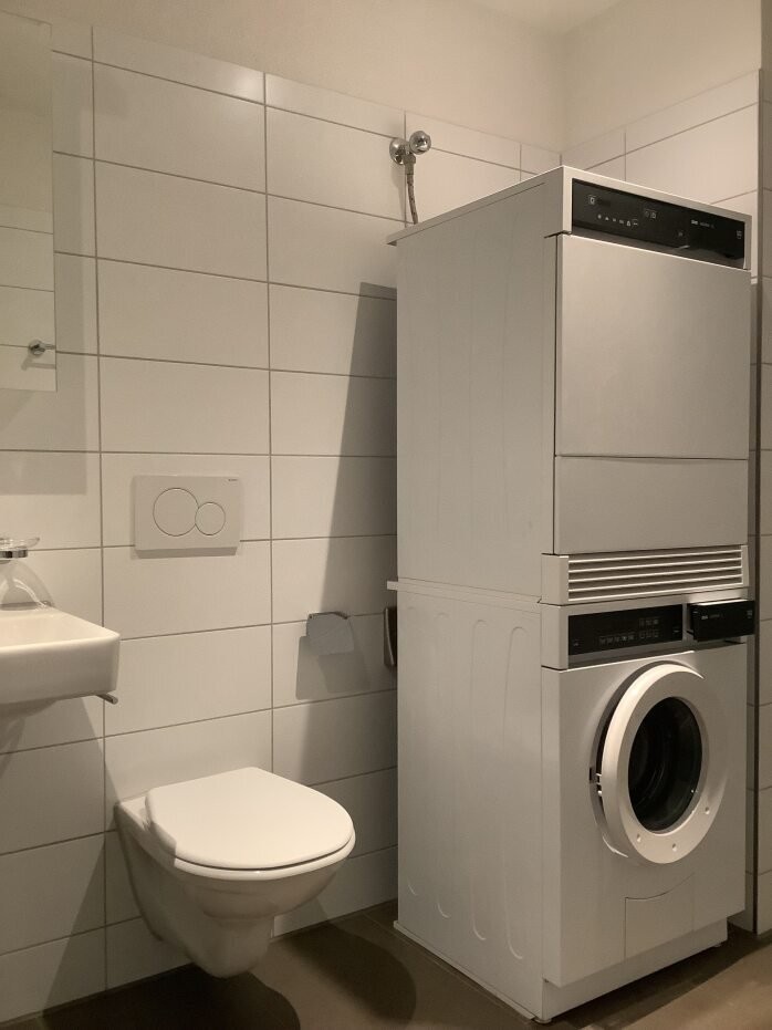 - Bad / WC mit eigenem Waschturm (Waschmaschine / Tumbler), Deckenspots und Plattenboden