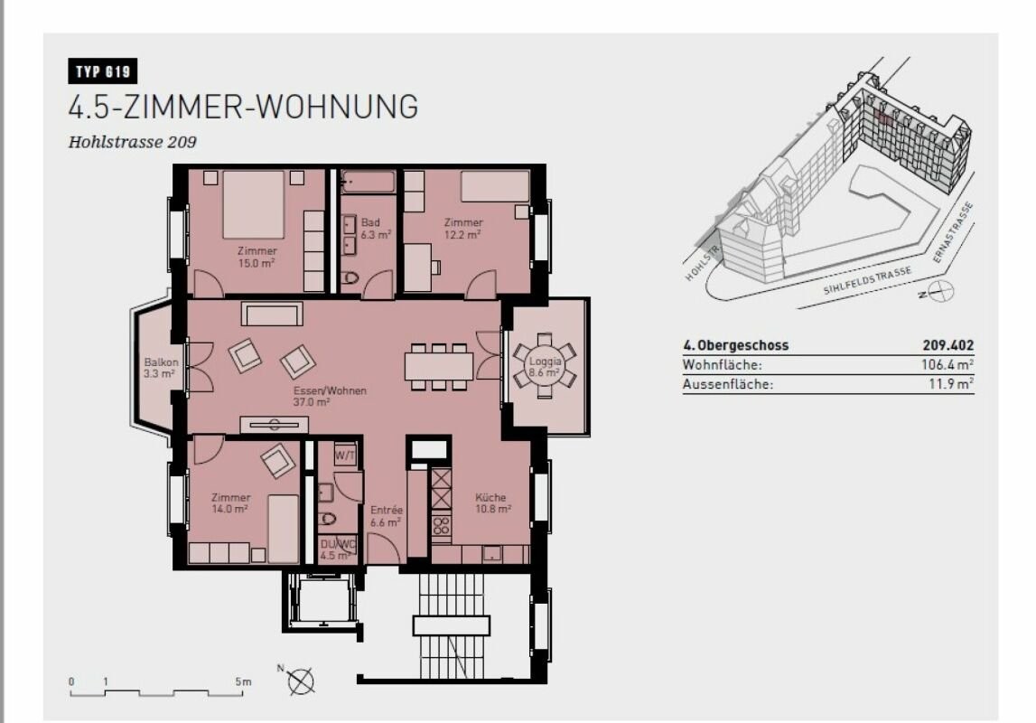 Die 4,5 Zimmer Wohnung im 4. Stock verfügt über eine moderne, offene Küche, ein geräumiges Badezimmer sowie eine Dusche inkl .Waschmaschine und Tumbler.