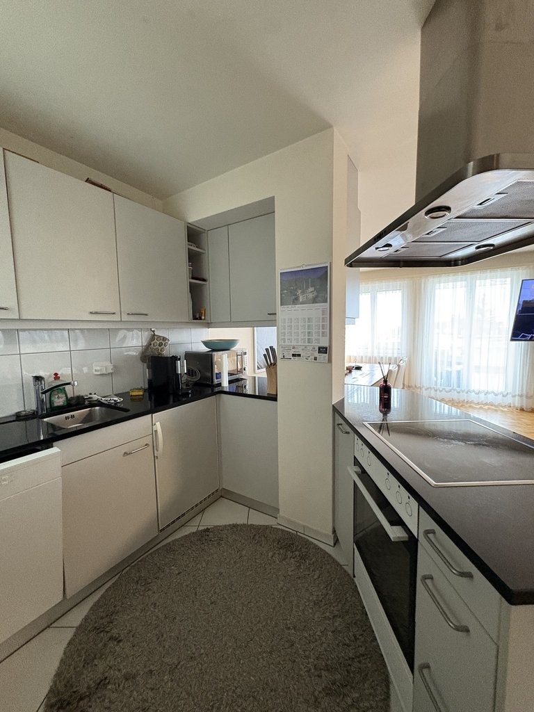 - helle Küche mit Glaskeramikherd, Backofen, Stauraum für die Küchenutensilien und Tageslicht.