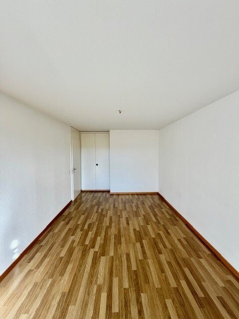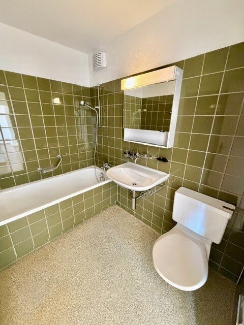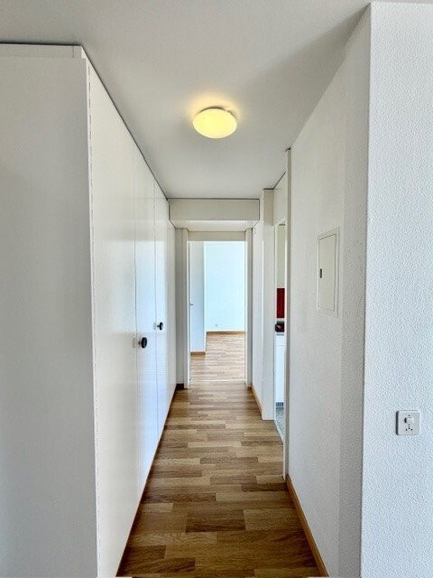 Der lichtdurchflutete Wohn- und Essbereich führt auf den Balkon mit schönem Weitblick bis in die Berge. Die Wohnung verfügt zudem über praktische Einbauschränke im Korridor und im Schlafzimmer, die für viel Stauraum sorgen. Die Küche und das Badezimmer entsprechen dem Baujahr und präsentieren sich in gepflegtem, funktionalem Zustand.