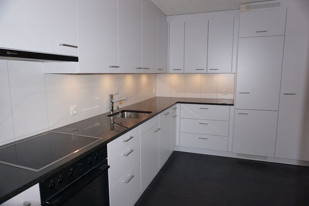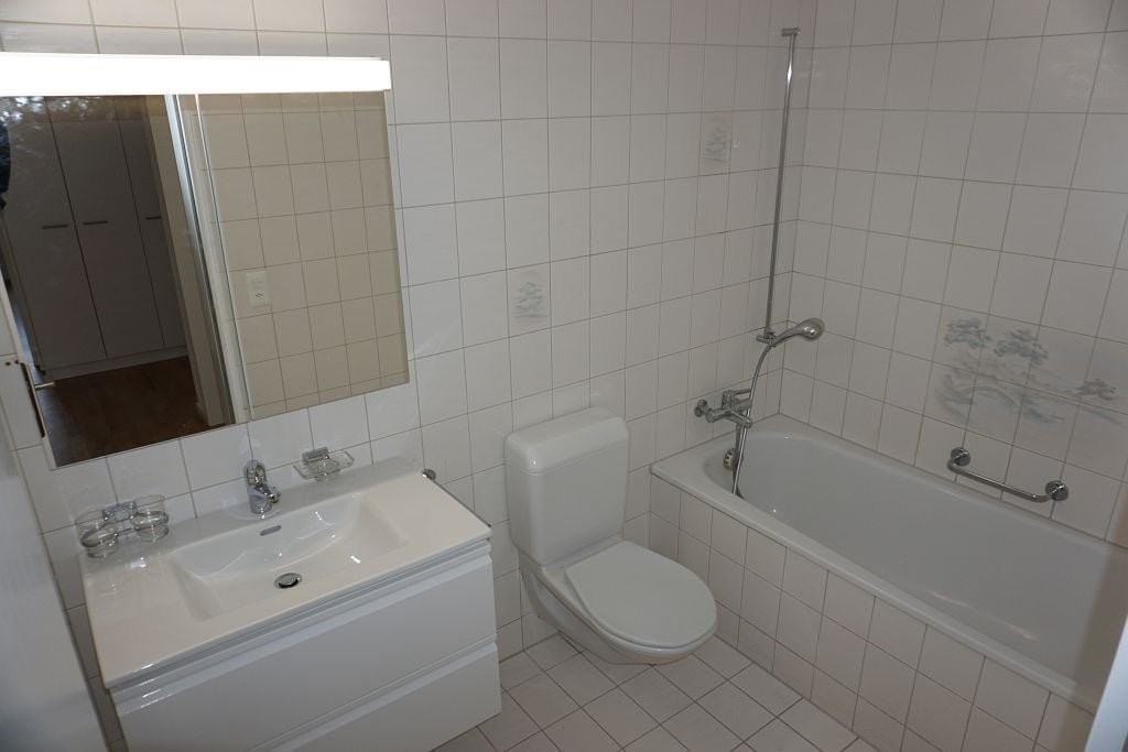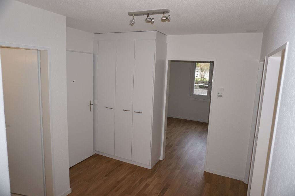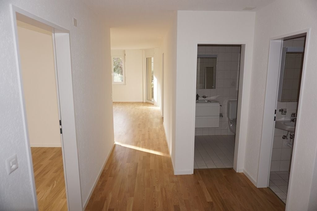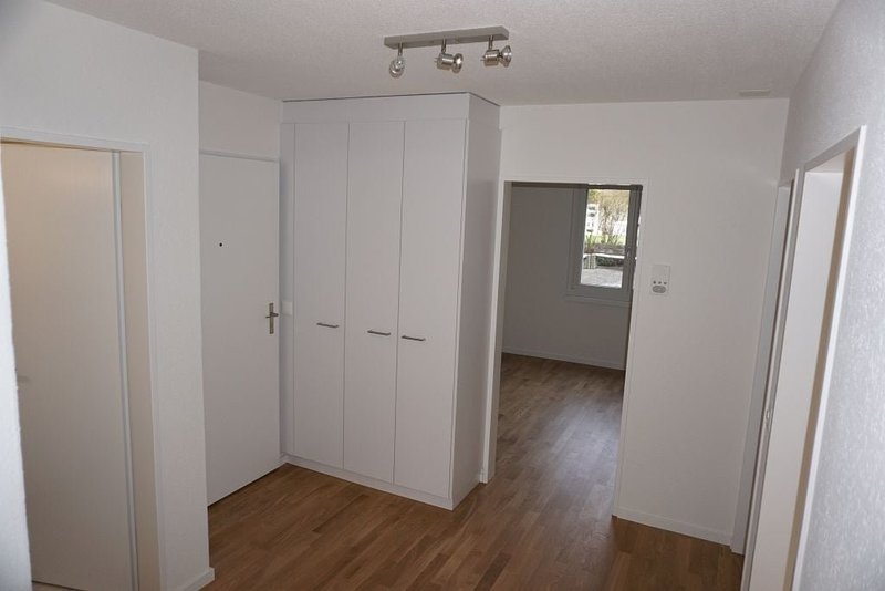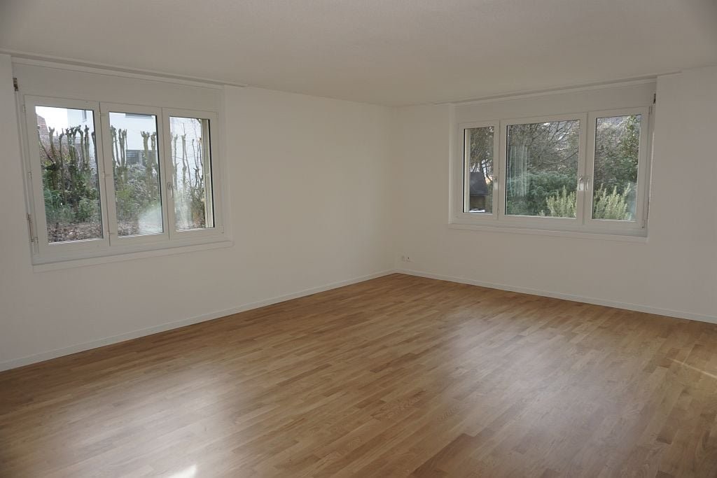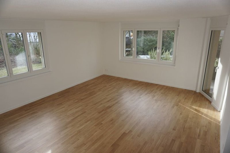 Plattenboden in Küche und Badezimmer. Moderne Küche mit Glaskeramik und Geschirrspüler. Parkett im Wohnzimmer und allen übrigen Zimmern. Einbauschränke. Badezimmer mit separatem WC. Gartensitzplatz, Keller- und Estrichabteil.