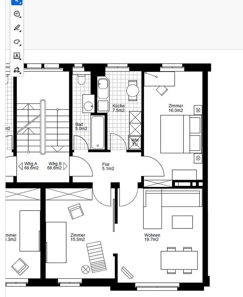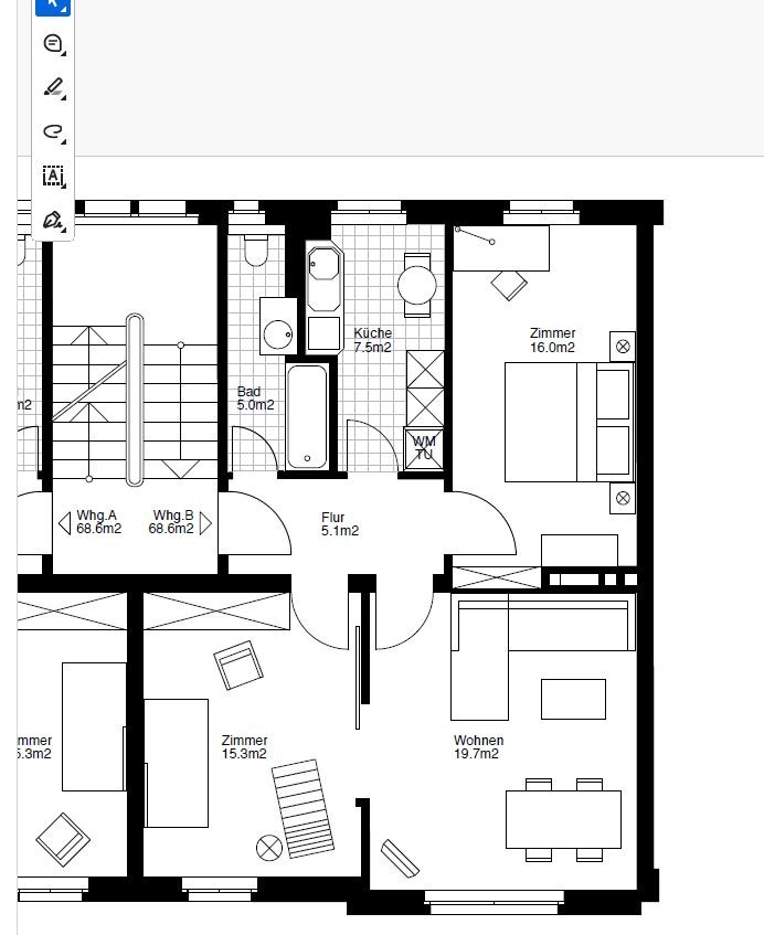 The flat has three spacious rooms: a living and dining space, a bedroom with an office corner and a child bedroom.