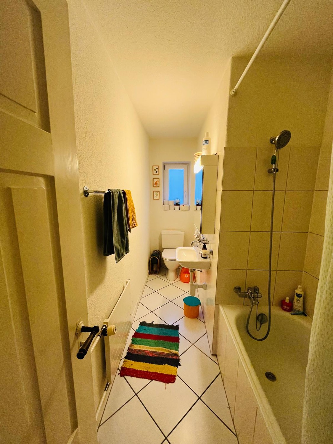 The kitchen is fully equipped with a standard size fridge, small freezer, an oven, a microwave and a dishwasher. The bathroom has a bathtub. The washing machine and dryer are in the basement. Their use is shared with the rest of the building but there is not a fix schedule and they are usually available.