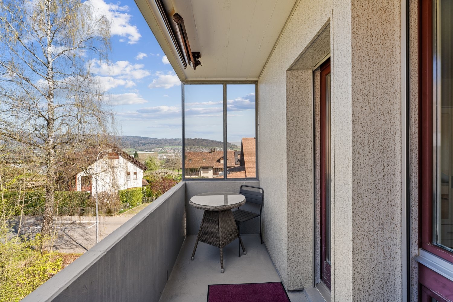 Sonniger, gedeckter Balkon mit Tisch & 2 Stühlen
