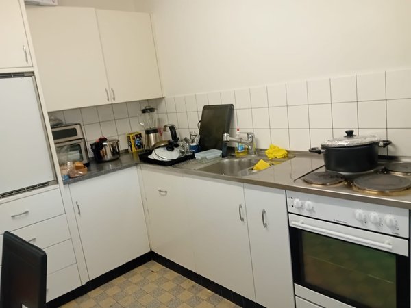funktionstüchtige Küche mit Kochplatten, grossem Kühlschrank und vielen Schränken.