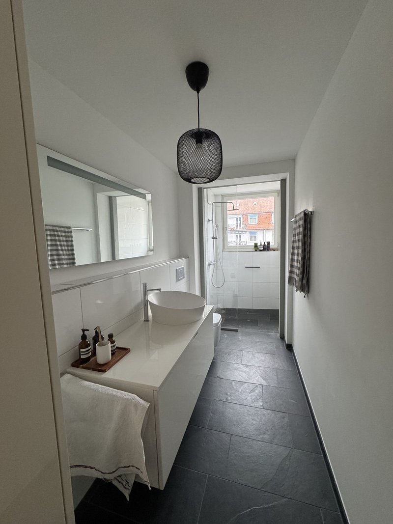 Stilvolles Badezimmer: Zeitgemäß ausgestattet mit hängender Dusche und schwarzen Fliesen