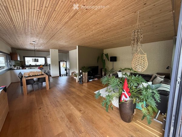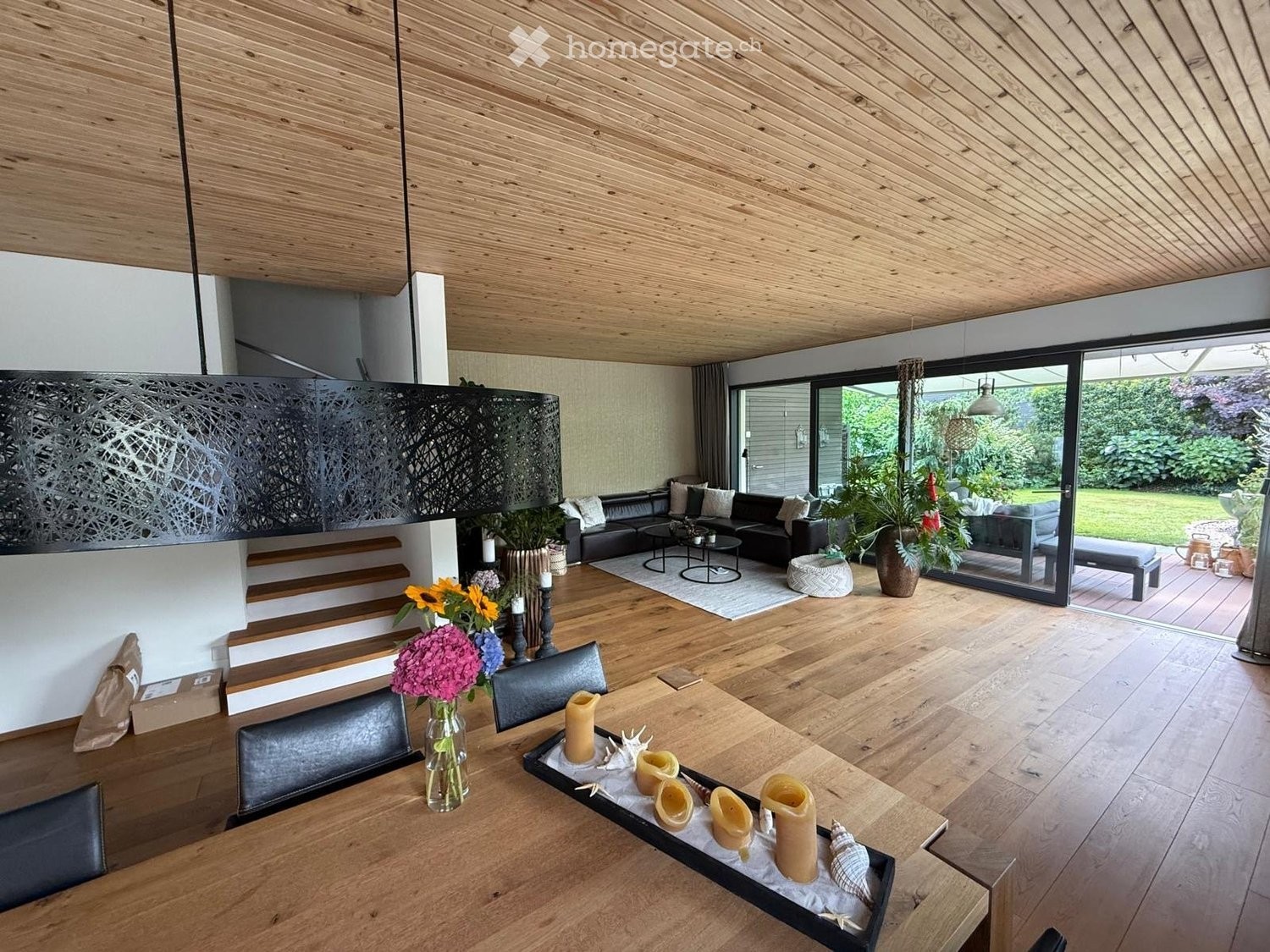 Im EG erwartet Sie ein WC und Reduit. Über 5 Treppenstufen geht es in den Wohn-/Essbereich mit offener Küche. Die praktische Küche bietet neben einem Wok noch Backofen/Steamer und Backofen/Mikrowelle. Die Stufenlose Schiebwand führt sie direkt in den Garten mit grossem gedecktem Sitzplatz, Aussenreduit, Senkrechtmarkise und Sonnenstore.