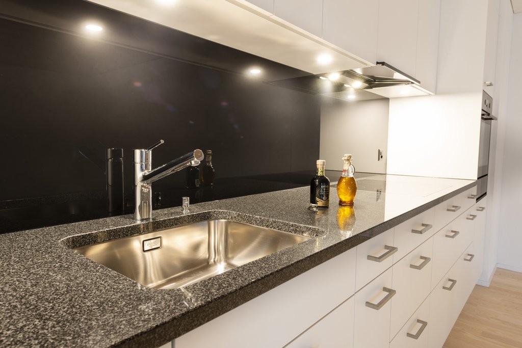 - Offene Küche mit Natursteinabdeckung, Glaskeramikherd und Geschirrspüler, welche Deine Lust zum Kochen weckt