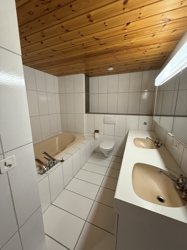 Badezimmer mit Toilette, Badewanne und Doppellavabo