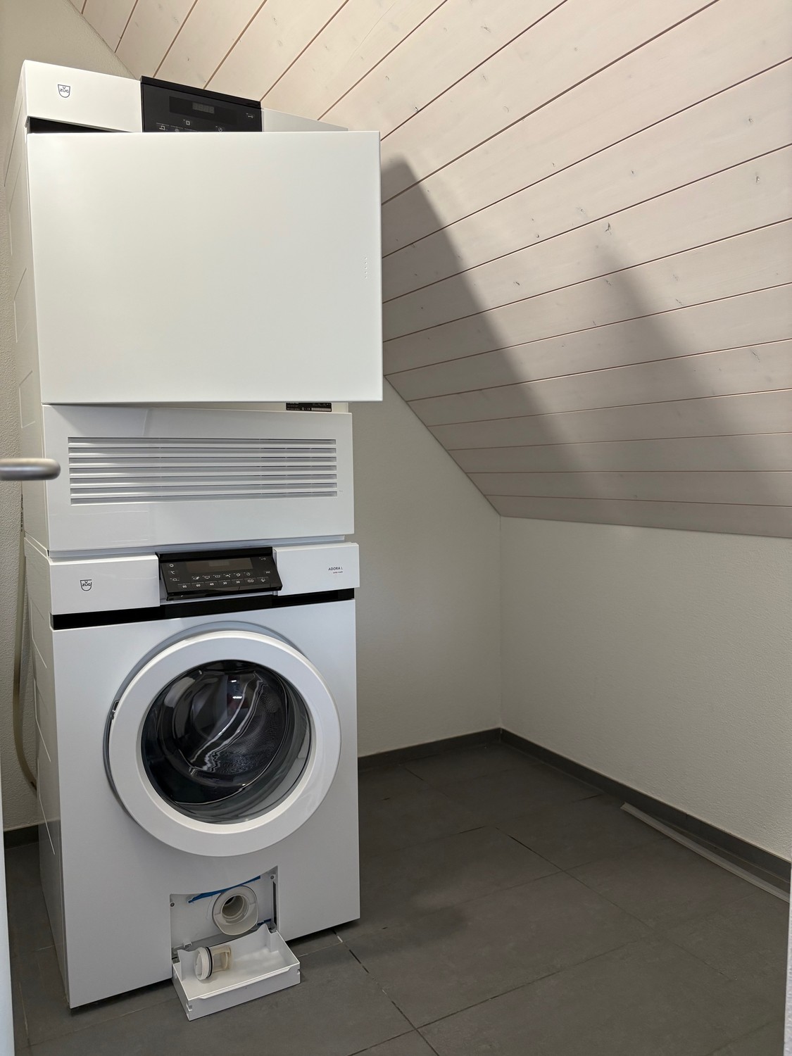 Im Reduit befindet sich ein Wasch-Turm mit Waschmaschine und Tumbler – sowie zusätzlichen Stauraum.