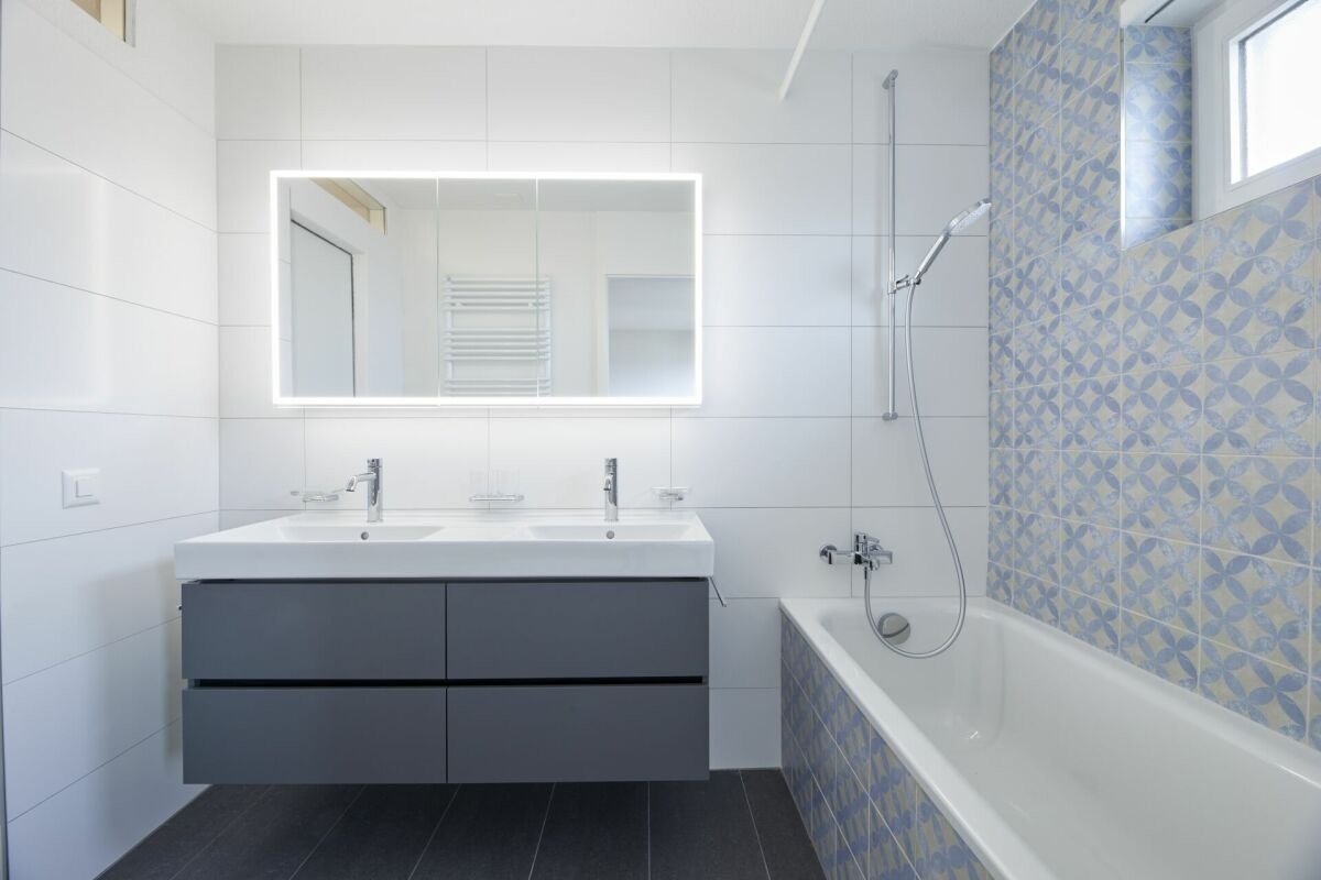 Das modern sanierte Badezimmer mit Badewanne, Dusche, Doppel-Lavabo und WC ist direkt vom Hauptschlafzimmer aus zugänglich