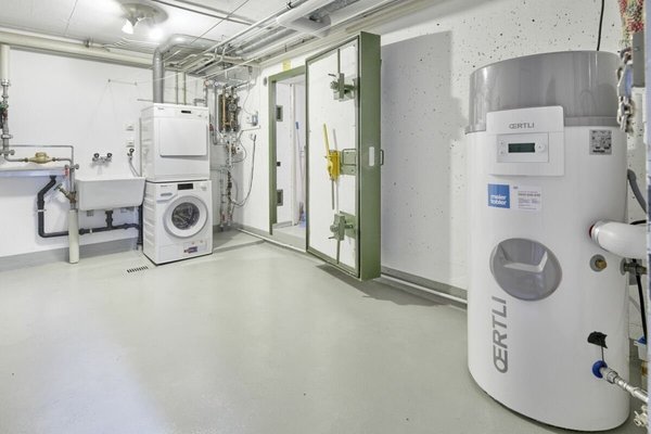 Praktischer Hauswirtschaftsraum mit Waschmaschine, Tumbler und zusätzlichem Stauraum - mit direktem Gartenzugang über die Aussentreppe
