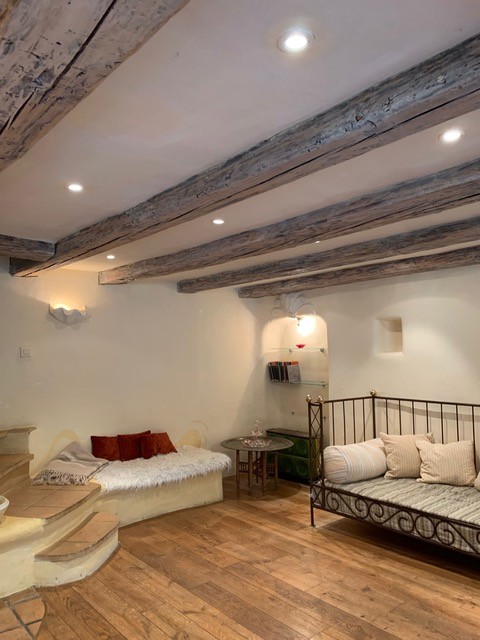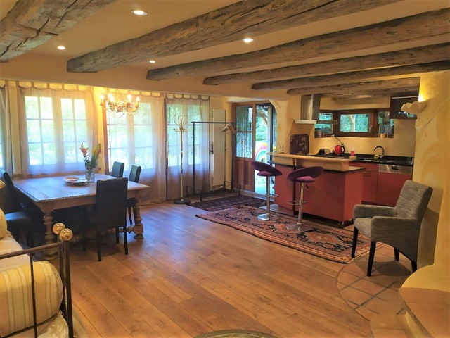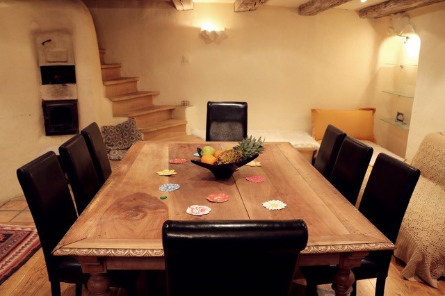 Gemütlicher Wohnbereich: Mit Holzbalkendecke, Kamin und stilvoller Einrichtung