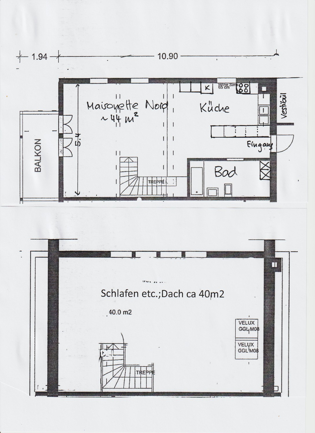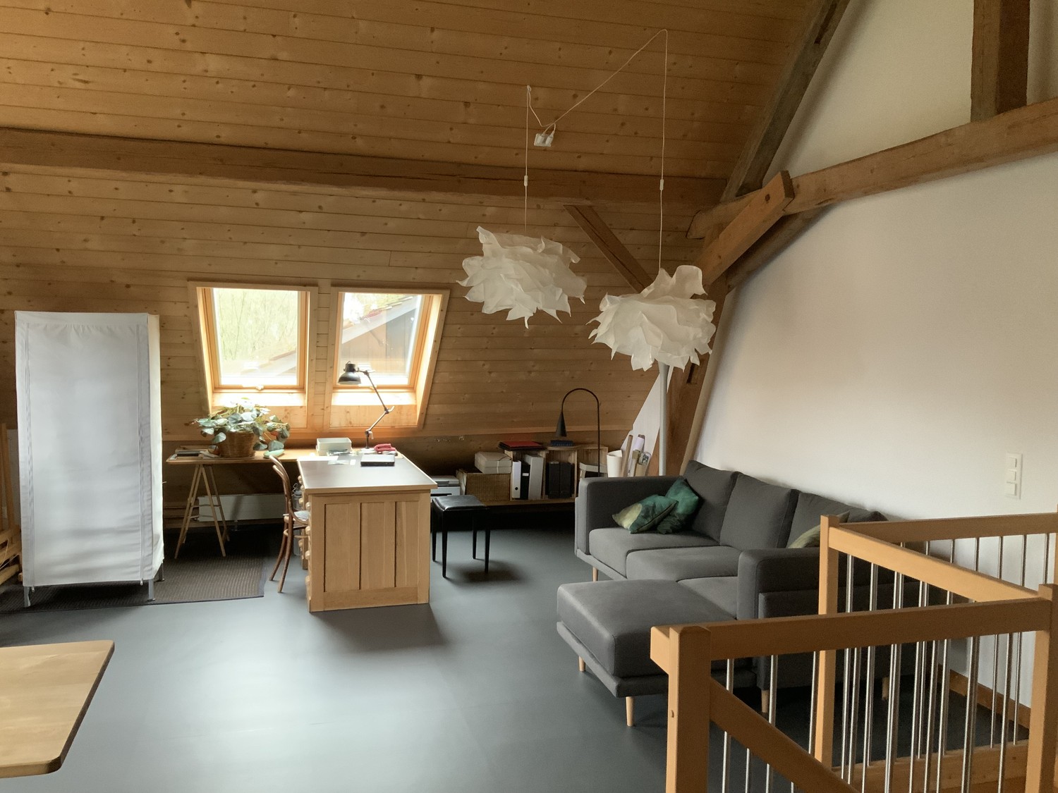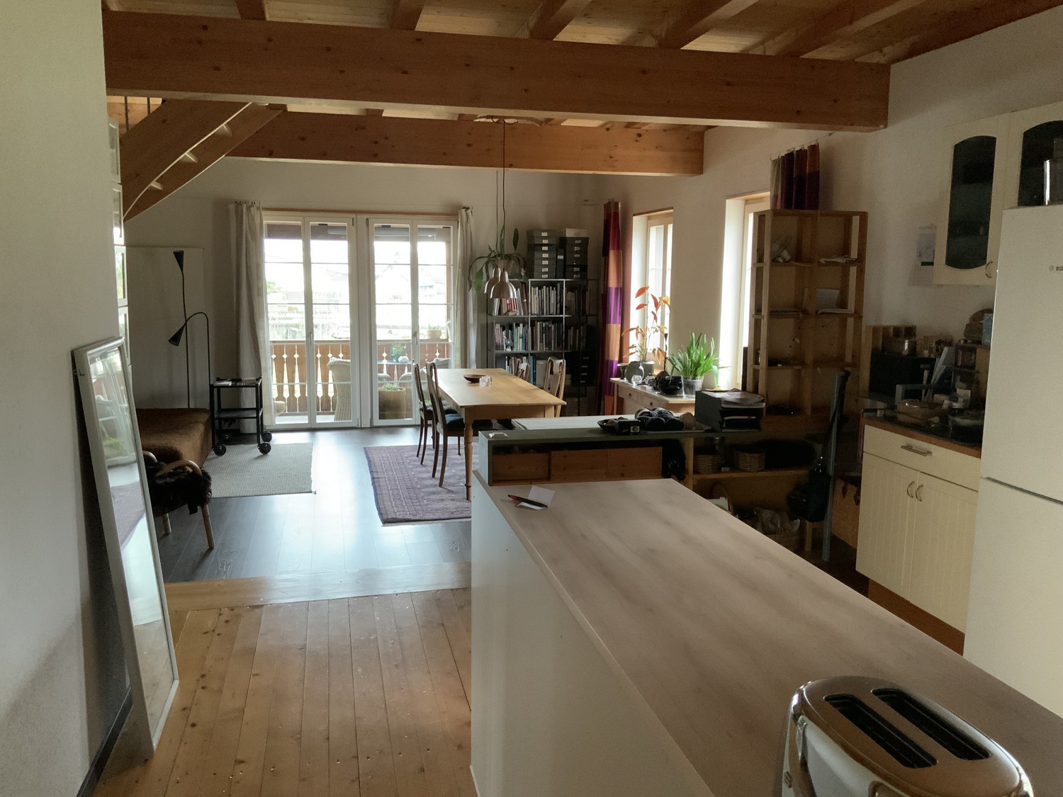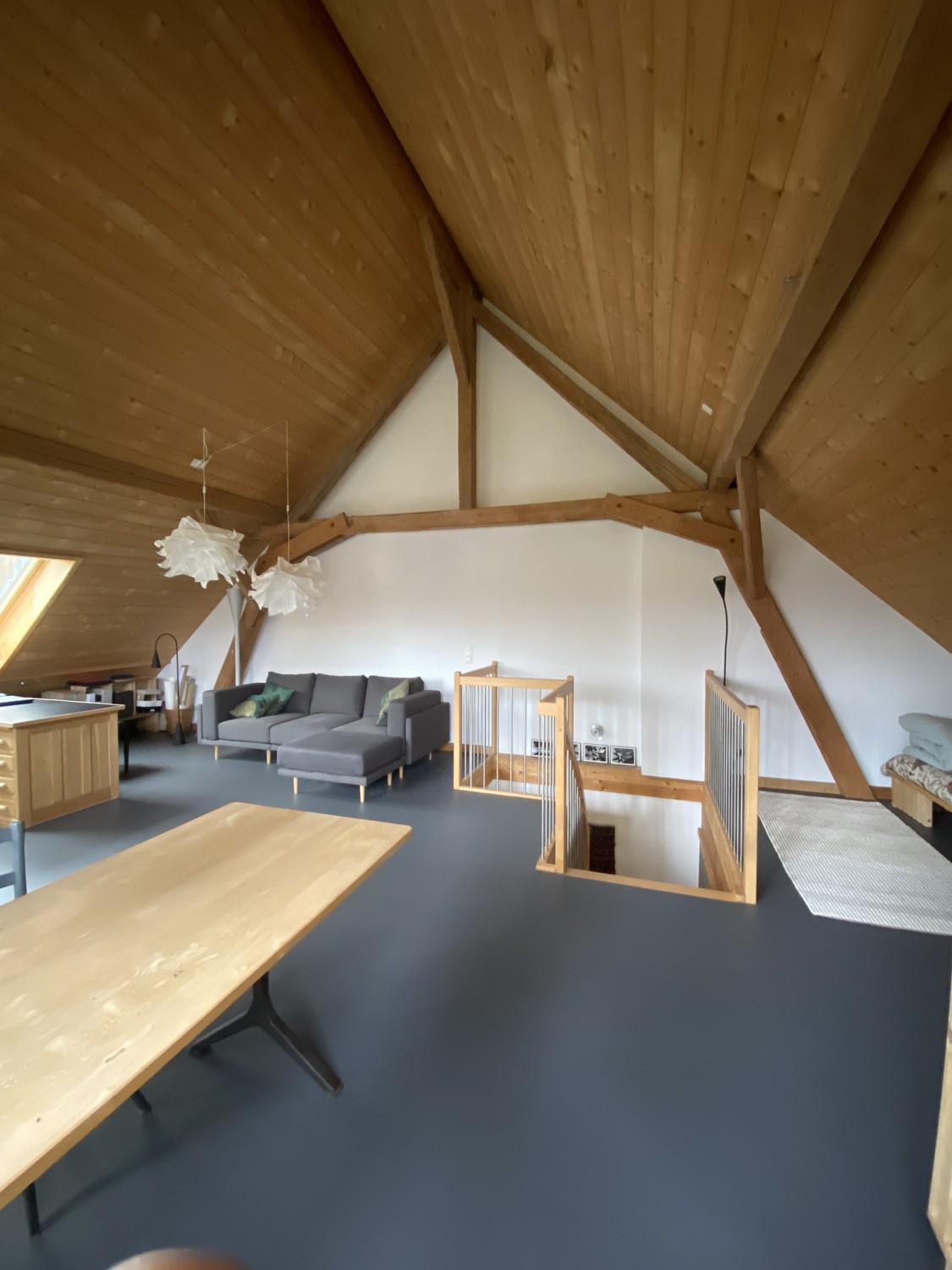 Die Maisonette-Wohnung verbindet den ersten Stock mit dem Dachgeschoss. Die beiden Etagen sind mit einer eleganten Holztreppe verbunden. Die Wohnung ist sehr offen: Unten der grosse Wohnraum mit Küche und Bad. Oben der helle Dachraum mit zwei Dachfenstern im Osten und eine Fensterfront nach Norden. Die gemeinsame Waschküche befindet sich im Erdgeschoss. Beheizt wird das Haus mit Erdgas. Nach Westen (Dorfseite) gibt es einen Balkon mit Abendsonne. Die andere Hälfte des Balkons gehört zur Nachbarwohnung. Die Wohnung ist geeignet für ein oder zwei Personen. Im Haus pflegen wir eine ruhige Nachbarschaft.