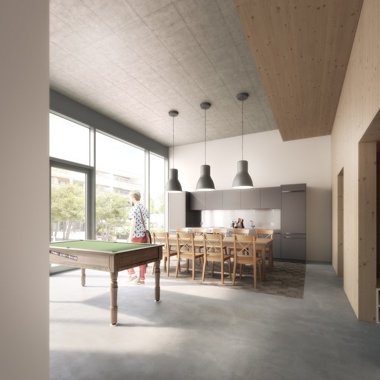 Zusammen leben heisst zusammen erleben! Vier doppelstöckige Zimmer teilen sich eine Küche mit einem grossen Esstisch und Stühlen.