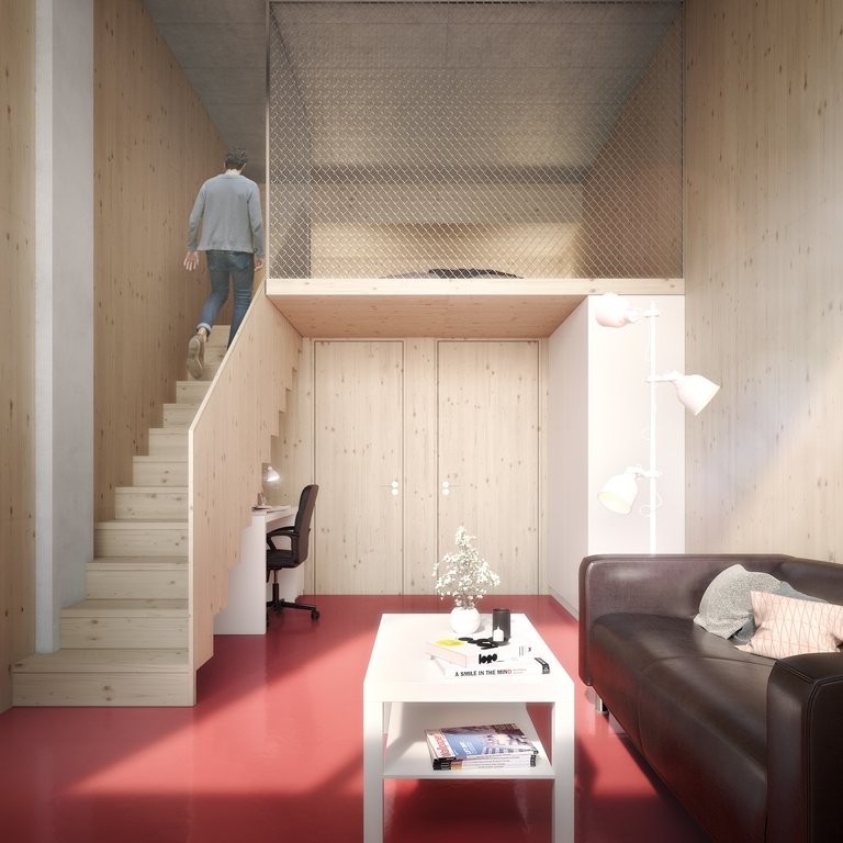 Alle Zimmer sind ca. 30 m² gross und haben ein eigenes Bad mit Dusche / WC. Der Schlafbereich ist über eine Treppe erreichbar. Zur Ausstattung gehört ein gemütliches Bett, ein Schrank, ein Pult sowie die Innenbeleuchtung. Jedes Zimmer verfügt über einen kleinen Vorraum, wo ein Fahrrad platziert werden kann.