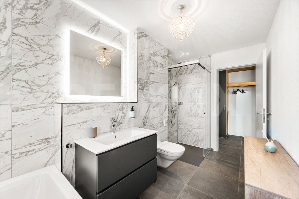 Der Wohnbereich mit offener Küche ist mit Parkettboden ausgestattet und erstreckt sich über ca. 30 m². Grosszügige Schiebetüren lassen den Raum den ganzen Tag über in Licht erstrahlen und bieten direkten Zugang zu einer grosszügigen 65 m² Terrasse, die mit einer Markise für sonnige Tage sowie mit Bodeneinbau-Spots für gemütliche Abendstunden ausgestattet ist. Die Terrasse bietet zudem eine schöne Aussicht.