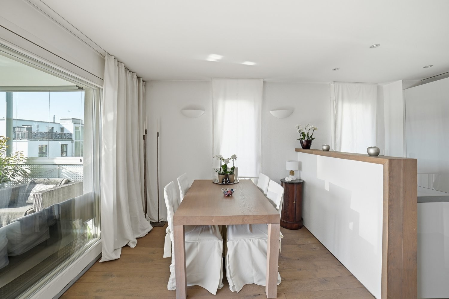 ● Grosszügiger Wohnbereich: Offenes Wohn- Esszimmer mit integrieter Küche mit elegantem Eichen-Holzboden, Schiebetüren zur gedeckten Holzterrasse und stimmungsvoller Beleuchtung ca. 50 m2