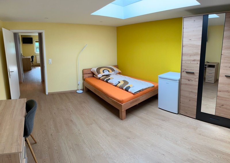 Im Zimmer: TV/Internet, Kühlschrank, Bett 140x200cm, Tisch/Stuhl, Frottée-/Bettwäsche