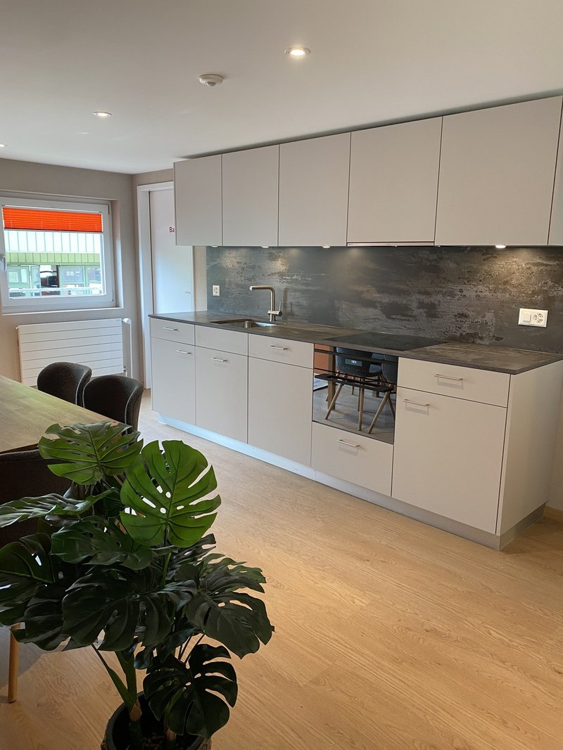 Sehr schöne, moderne Gemeinschaftsküche mit Abwaschmaschine und Kombi Backofen/Mikrowelle und 2 WC/Duschen, Aufenthaltsraum, Geschirr- und Kochsets