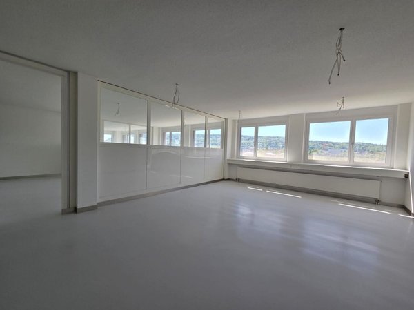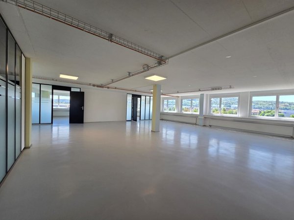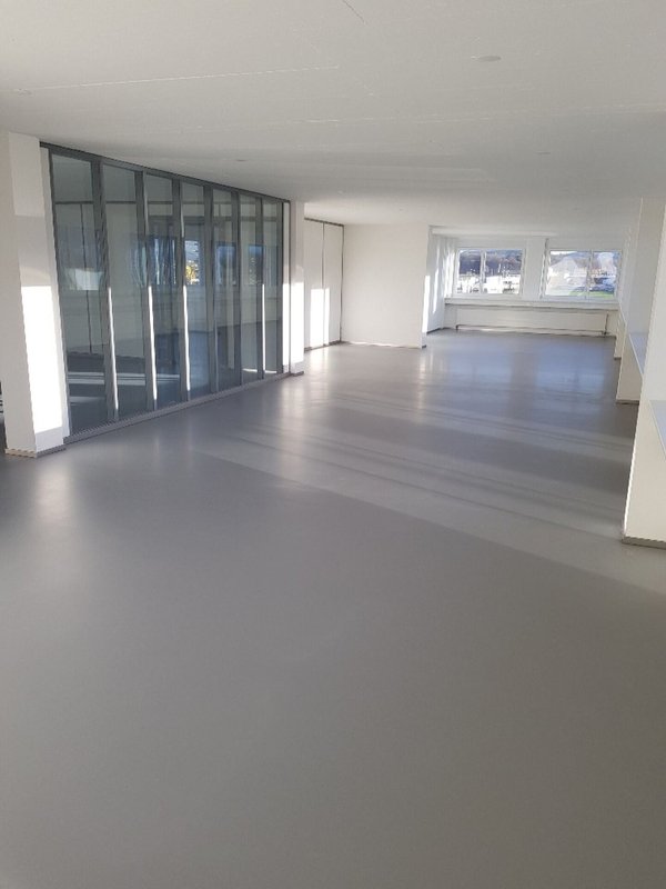Modern ausgebaute Flächen mit grosszügigen, schallisolierten Fensterfronten und hellen, modernen fugenlosen Bodenbelägen mit Polyurethanharz-Beschichtung.