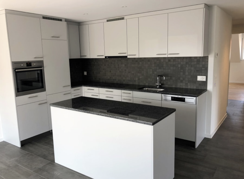 Die moderne Küche mit einer grosszügigen Arbeitsinsel bietet viel Stauraum und Arbeitsfläche und eignet sich ideal für alle, die gerne kochen. Die beiden Zimmer sind mit hochwertigem Parkett ausgestattet und sorgen für eine warme, wohnliche Atmosphäre.