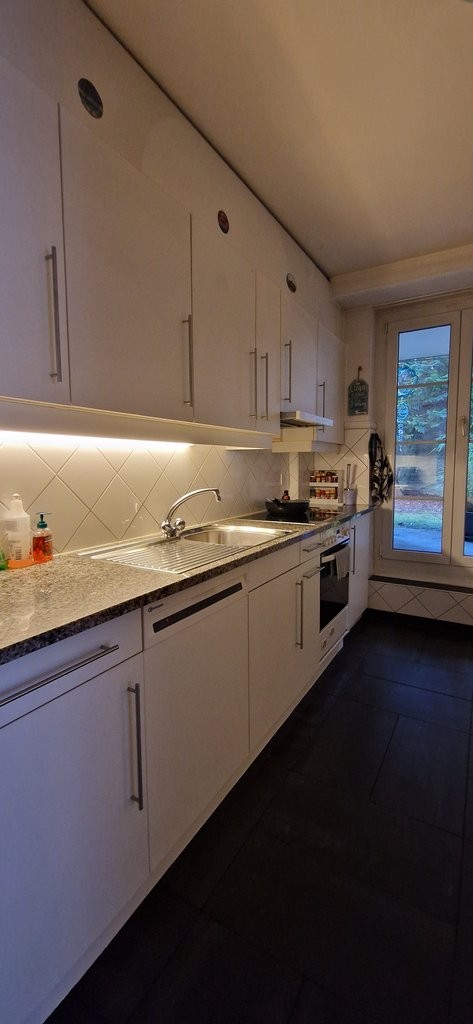 moderne Küche mit Zugang zum Balkon