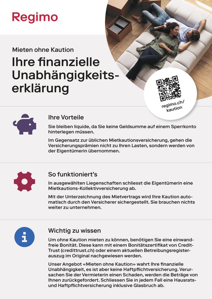 Bei diesem Mietobjekt müssen Sie nicht wie üblich drei Monatsmieten als Kaution auf ein Sperrkonto einzahlen. So bleiben Sie liquid, da nicht eine grössere Geldsumme für die Dauer Ihres Mietverhältnisses blockiert ist. Und das Beste: Das Angebot "Mieten ohne Kaution" ist für Sie gratis. Erfahren Sie mehr aufhttps://regimo.ch/kautionoder auf dem Flyer in der Fotoserie des Inserates.